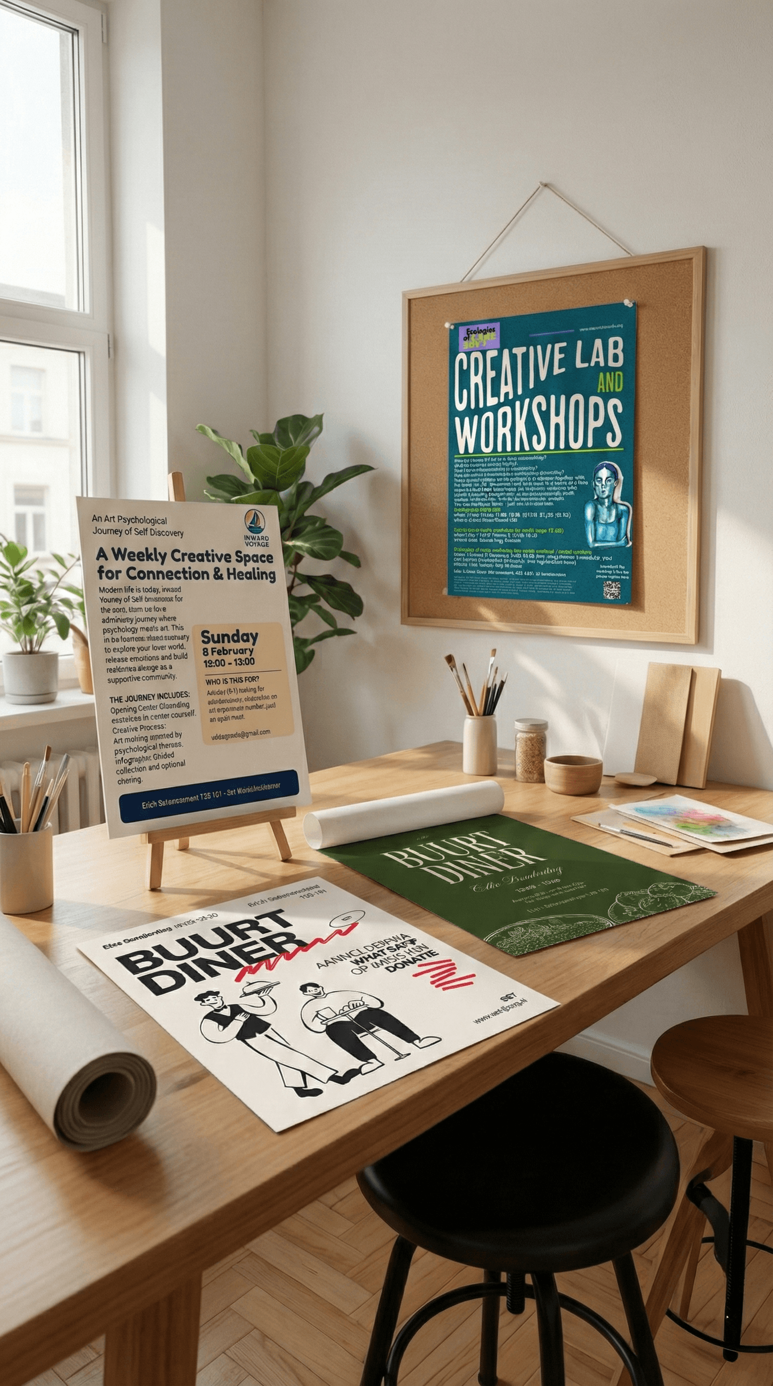 In a world optimized for infinite scroll, we pause to design the tangible. Look closely at the desk. The "Inward Voyage" on the easel isn't asking for your clicks; it's asking for your breath. The "Creative Lab" on the corkboard isn't selling a skill; it's offering a tribe.